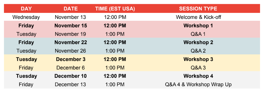 WORKSHOP SCHEDULE - ALL TIMES IN EST (US - NEW YORK)